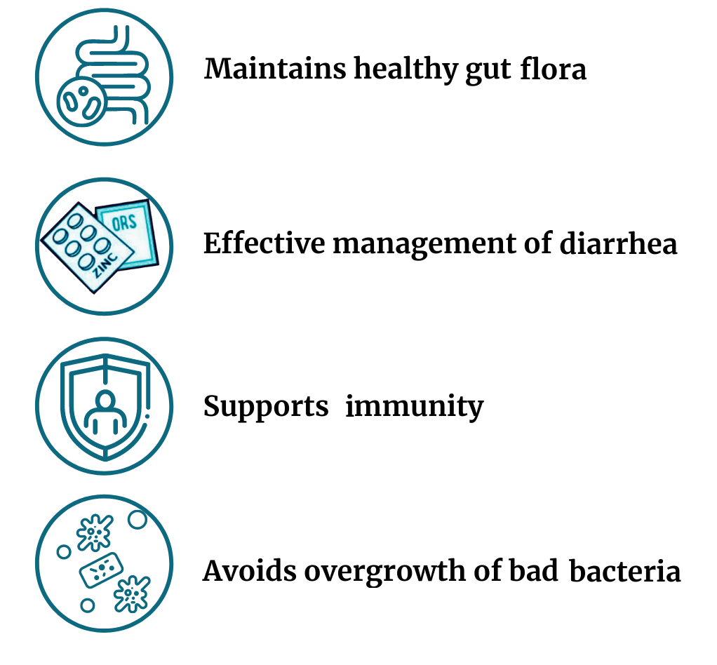 Zinc benefits children with diarrhea because it is a vital micronutrient. Zinc is essential for protein synthesis, cell growth and differentiation, immune function, and intestinal transport of water and electrolytes. This combination helps to restore gut bacteria, promotes immunity, and regulates intestinal fluid transport.